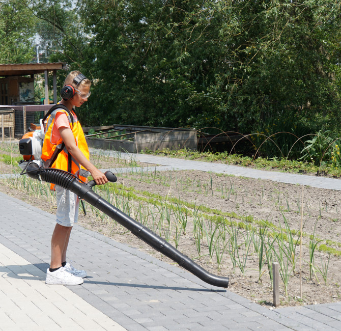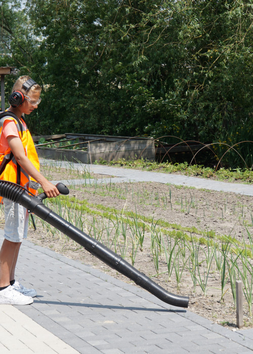 Groen : Hier ga je werken met machines zoals een heggenschaar, trilplaat, bladblazer, hogedrukspuit, versnipperaar en nog vele andere apparaten. Ook leer je straten in onze speciale straatbak. Je leert daar te werken aan verschillende opdrachten met verschillende stenen. Verder ben je dat half jaar bezig met het leren schutting zetten en de tuin aanleggen en onderhouden. We doen ook verschillende klussen buiten school, zo knappen we bijvoorbeeld wel eens tuinen op bij mensen thuis!