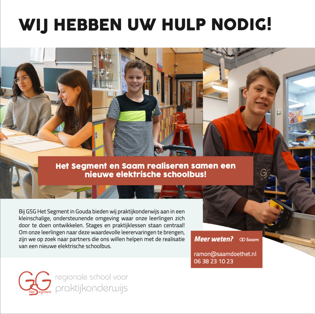 Saam, onze partner voor de realisatie van ons vervoersproject, zal Het Segment ondersteunen bij de verwezenlijking van onze nieuwe schoolbus die volledig aansluit bij de behoeften en wensen van onze leerlingen. Door het aanbrengen van uw bedrijfslogo op onze schoolbus zijn wij voor 5 jaar lang gegarandeerd van vervoer op maat.